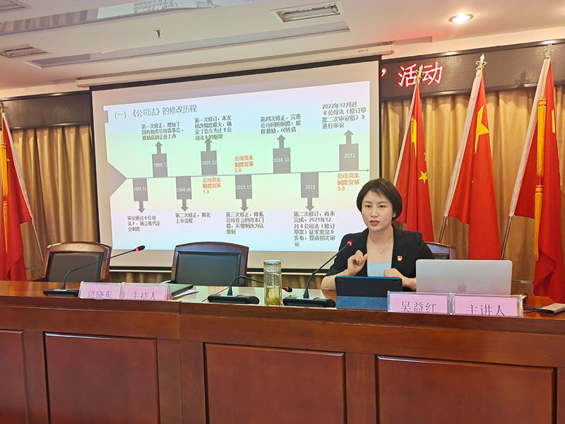 讲座中,市律师协会公司与企业合规专业委员会主任吴益红以“公司法(修订草案)对公司实务的影响”为题,围绕公司法的修改历程、公司法(修订草案)的重要变化、国有出资公司的特别规定等主要内容,以理论结合案例的讲授方式,对公司法重点条款进行系统阐释。